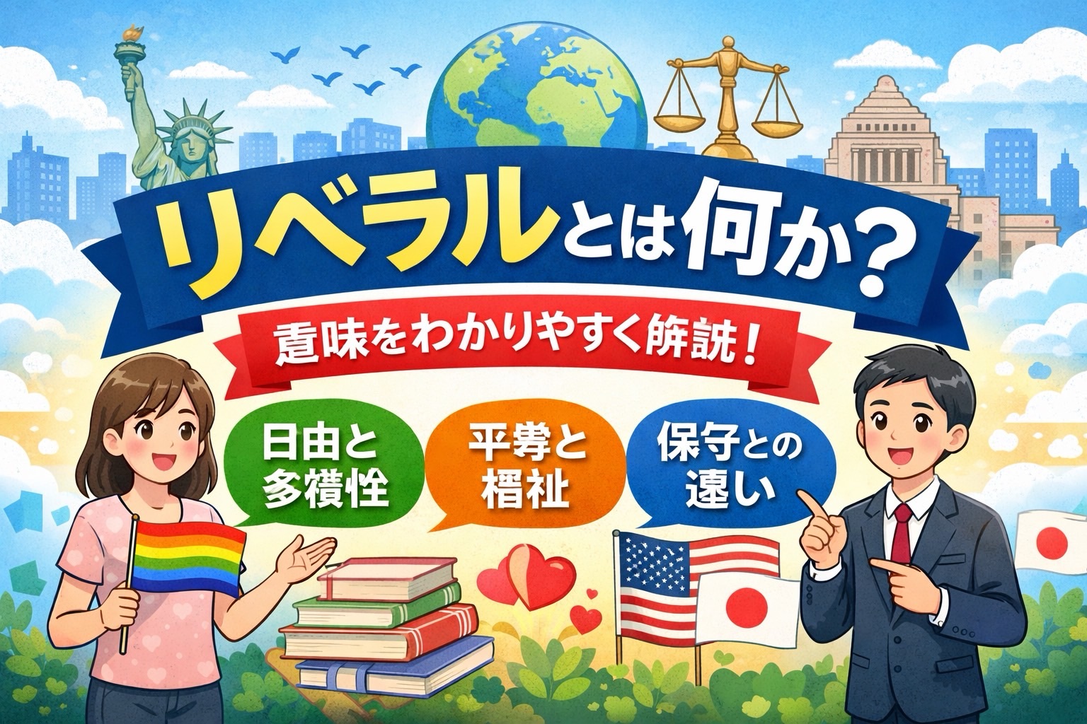 「リベラル」という言葉をニュースやSNSでよく見かけますが、正確な意味を説明できますか? 本記事では、リベラルの基本的な意味から、保守との違い、日本とアメリカでの使われ方の違いまで、初心者にもわかりやすく解説します。