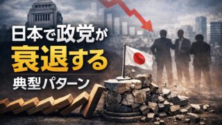 日本の政治では、政党が突然消えるのではなく、選挙ごとに支持を失い徐々に影響力を弱めていく傾向があります。理念先行や反対専門化など、政党が衰退していく共通パターンを整理して解説します。
