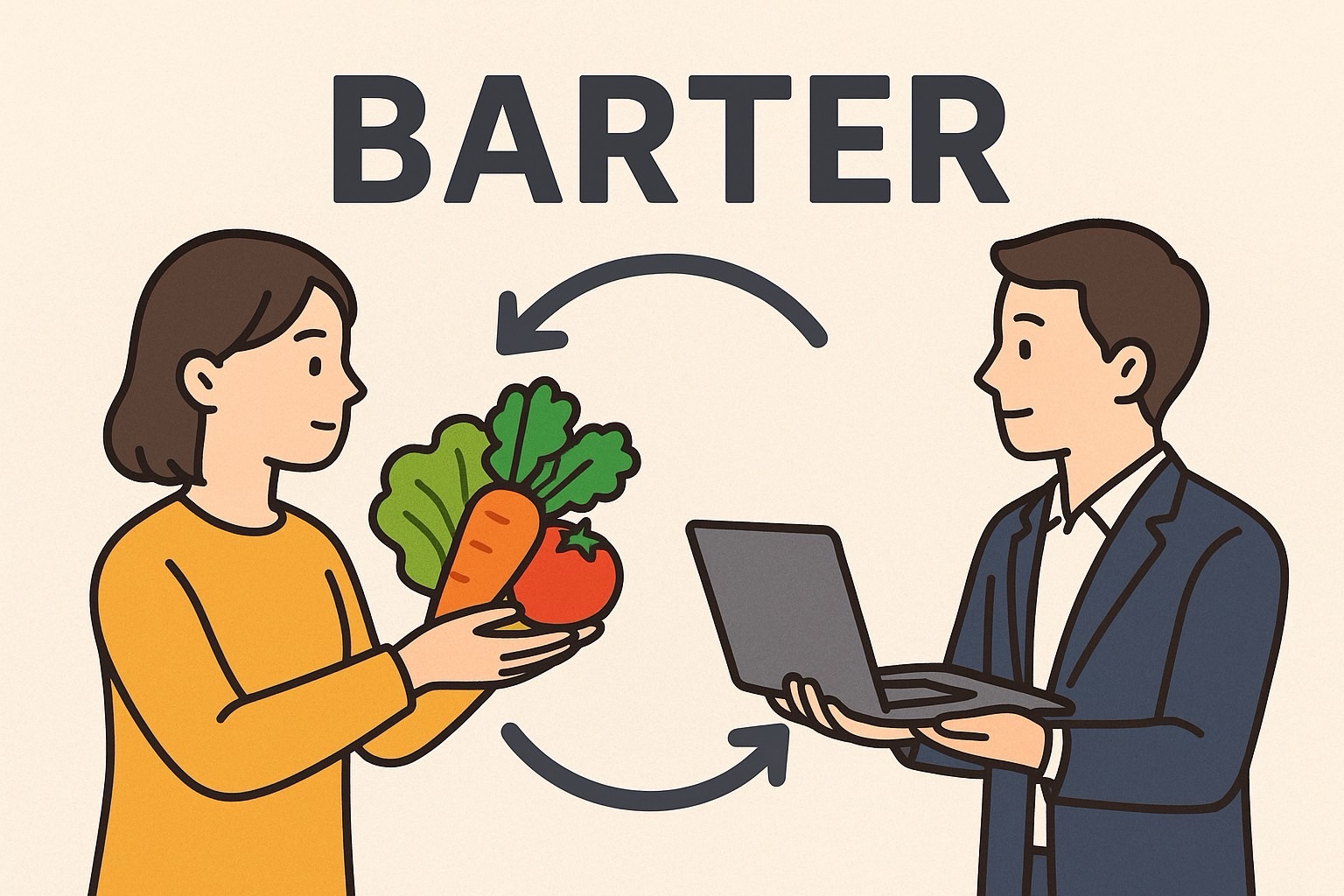 - 物と物の交換:野菜と魚を直接交換する(伝統的な物々交換)