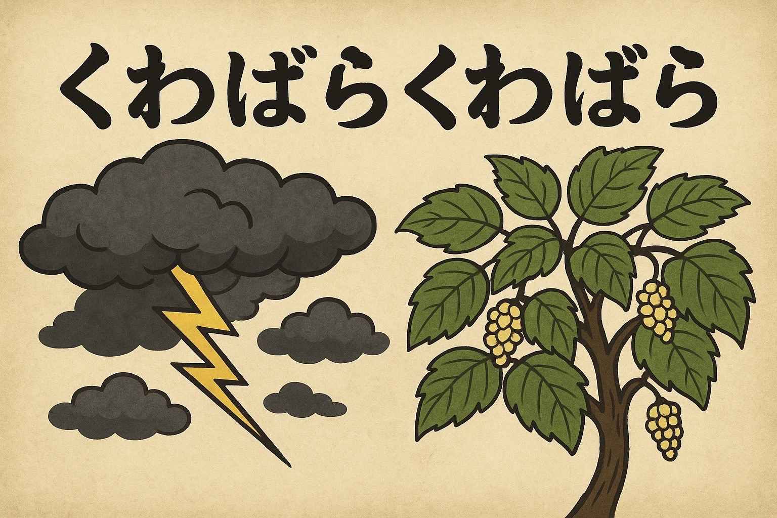 「くわばらくわばら(桑原桑原)」とは、昔から日本で使われてきた雷除け(かみなりよけ)のまじないの言葉です。
