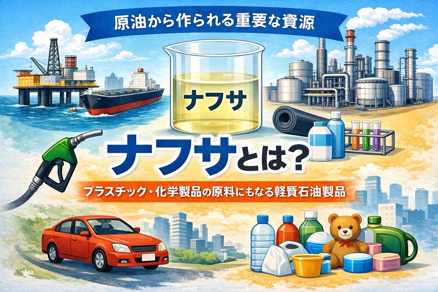 ナフサ(Naphtha)は、原油を精製する過程で得られる軽質の石油製品の一つで、主に石油化学産業の原料として使われています。私たちの生活に欠かせないプラスチックや化学製品の多くは、このナフサから作られています。
