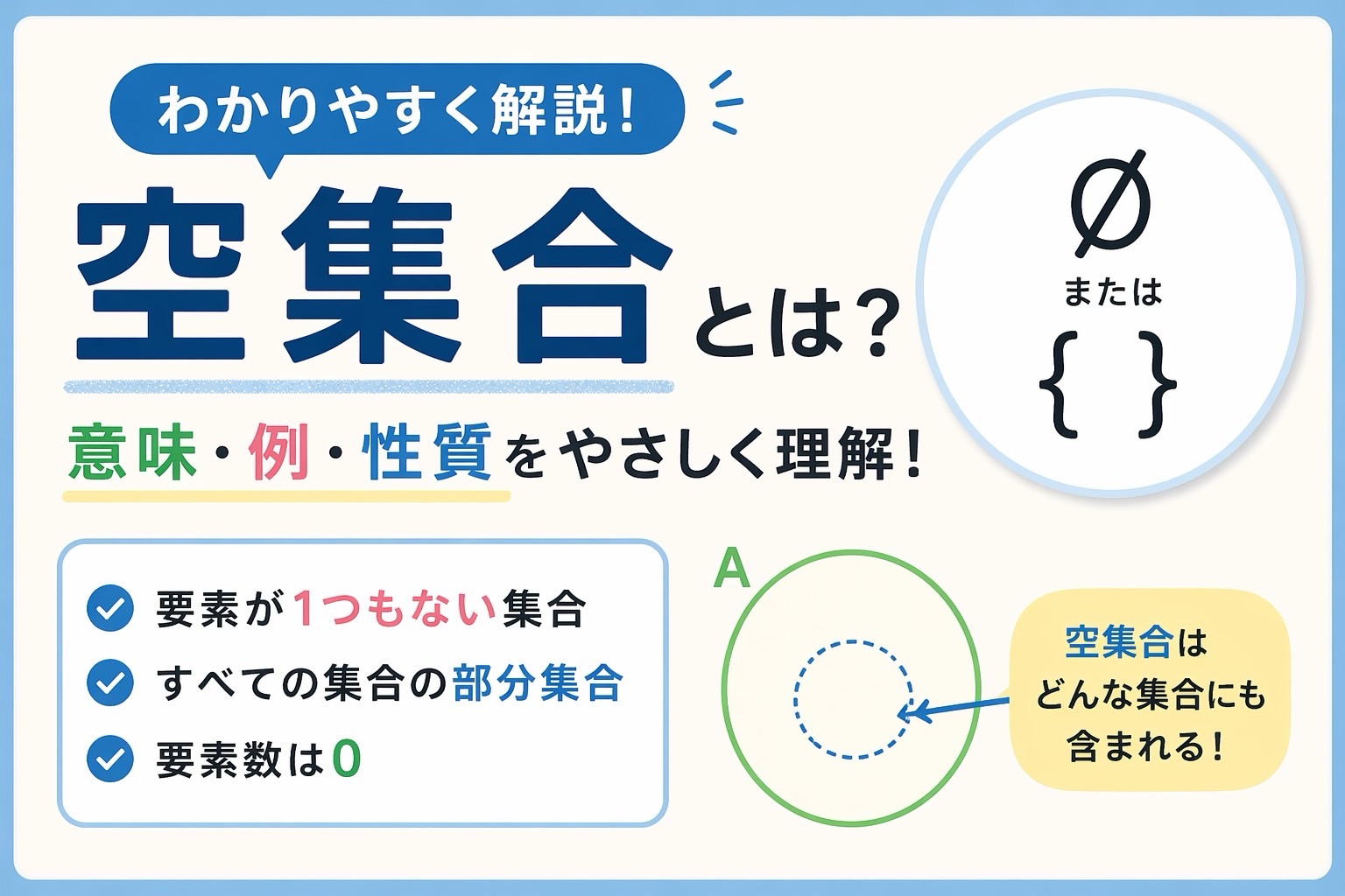 「空集合(くうしゅうごう)」は、数学の集合論における最も基本的な概念のひとつです。 難しそうに聞こえますが、実はとてもシンプルです。本記事では、初心者でも理解できるように、具体例を交えてわかりやすく解説します。