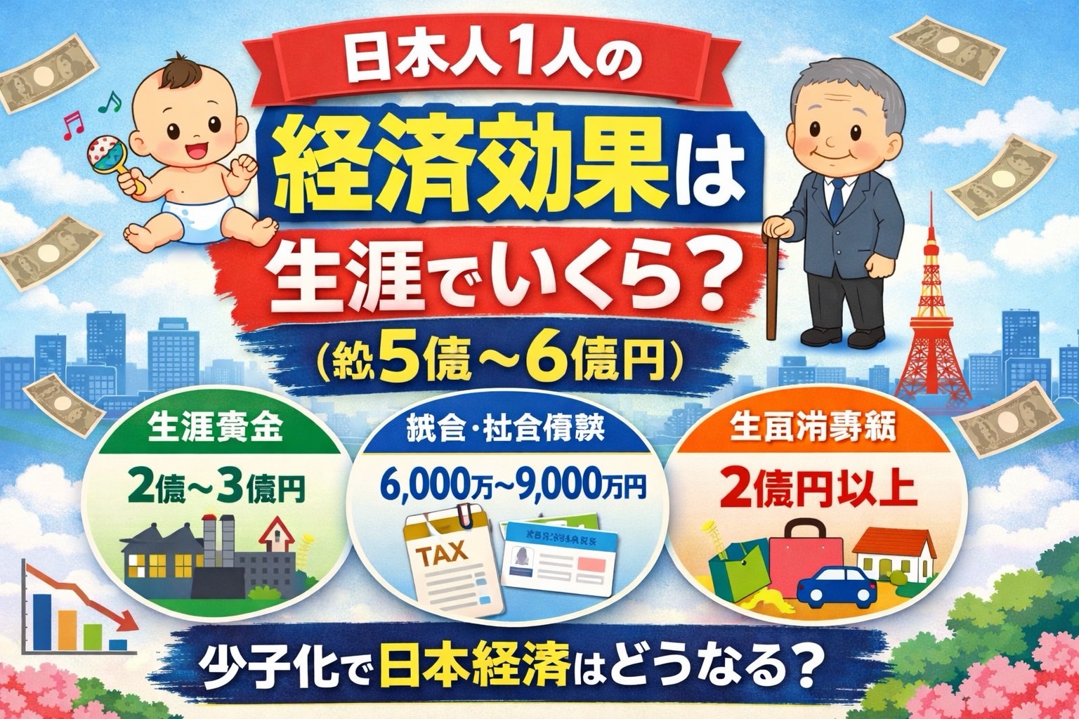 日本人1人が出生から死亡までに社会へもたらす経済効果はどのくらい? 生涯賃金、税収、消費、GDP貢献額をもとにわかりやすく解説します。少子化問題との関係も整理します。