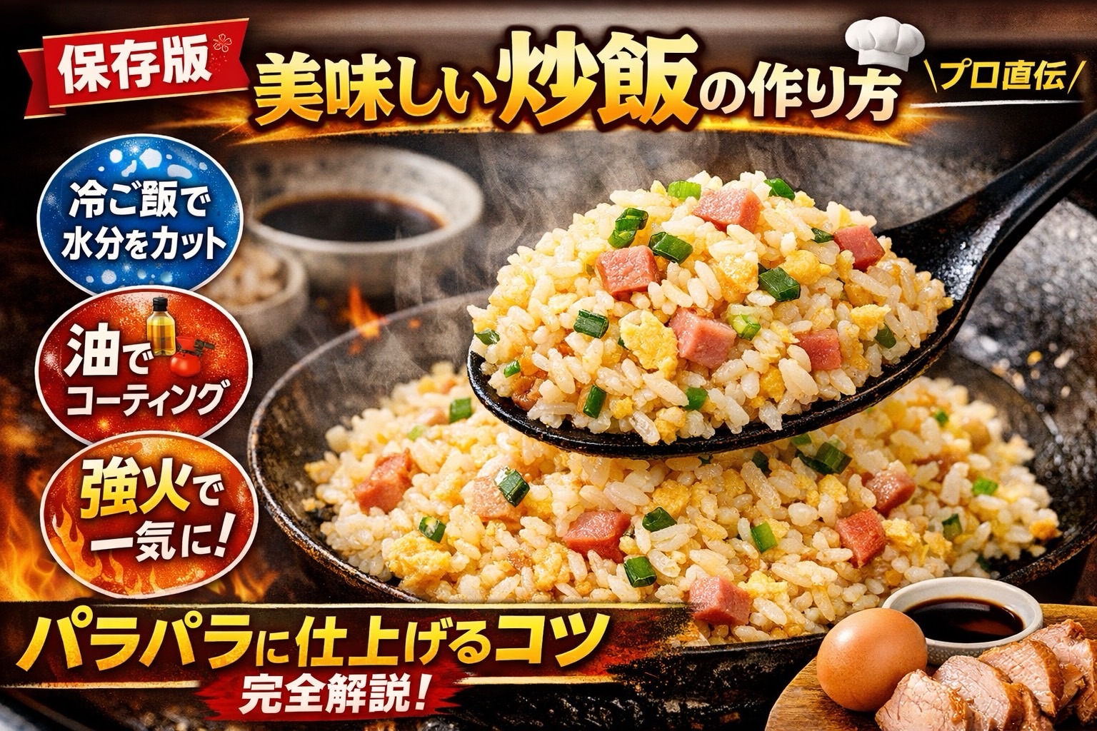 美味しい炒飯を作るためには、次の3つが重要です。